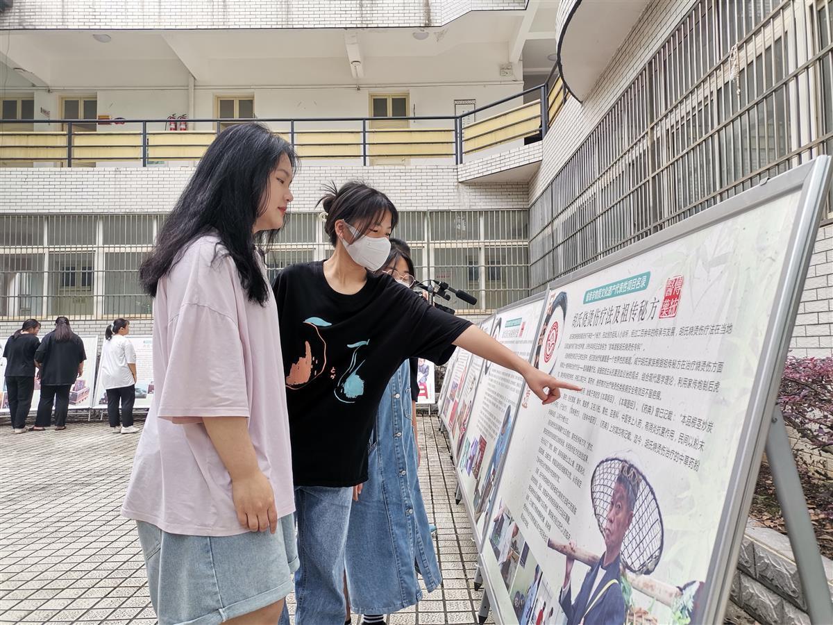 在一幢绿萌掩映的学院大楼边,马钱子疗法,大幕高腔戏,咸宁竹雕,金丝龙等20余块非遗文化展板吸引学生们驻足。在展板中央,学生们正热情地围在农民老师周围听课练乐器。“通过老师们精彩的非遗表演,让我们看到了以往的生产、生活方式,传承非遗文化,年轻人必须贡献青春力量。”湖北科技学院音乐学院学生靳佳敏表示,将把咸安山歌等非遗文化带回家乡,让更多人知晓。
