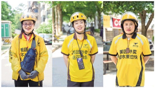 拼版照片:左图为美团外卖武汉街道口站骑手张雨晴;中图为美团外卖武汉武泰闸站骑手沈海燕;右图为美团外卖武汉武泰闸站站长张霞。记者伍志尊摄
