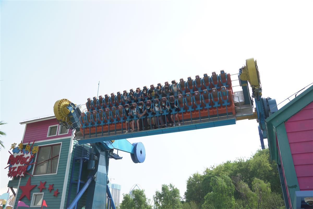 只见“完美风暴”设备下卡臂慢慢升起,上卡臂也打开了。打开过程中,维修及运行人员不停地在安抚着游客。