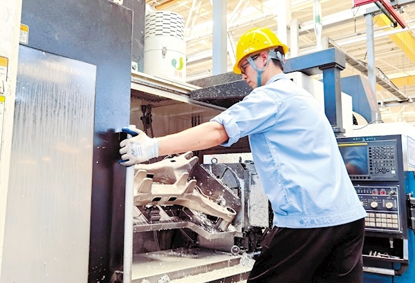 湖北航特装备制造股份有限公司生产车间内,工作人员正操作设备处理铝合金底盘零部件。 (通讯员 杨熠 摄)