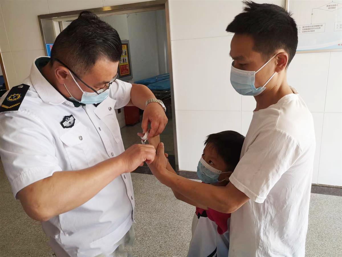 6月14日下午三时,急诊科来了位焦急的男子,他拉着哭泣的孩子前来就诊:“医生呢,医生,快来看下我孩子的手!”此时正准备去检查120车辆的副站长陈大叔闻声而来。“别急别急,我来先看下。”