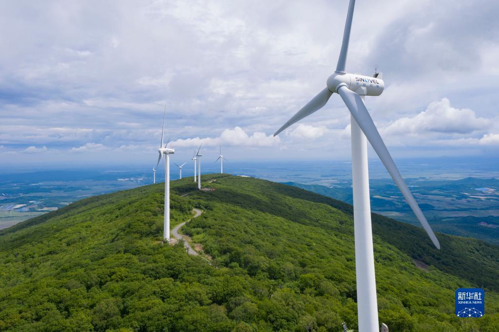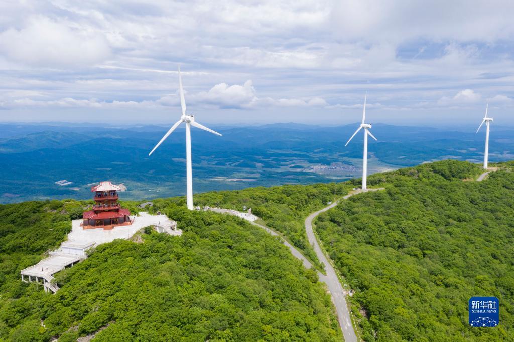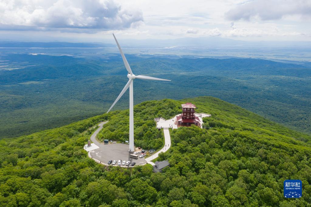 6月19日拍摄的黑龙江饶河大顶子山森林公园内的风电机组(无人机照片)。新华社记者 谢剑飞 摄