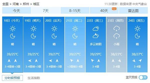 河南此轮高温天气超长待机,6月22日左右高温都将持续在线。比如郑州,未来一周高温将天天见,38℃以上热浪或连续5天在线,目前郑州市处于高温红色预警中,今天白天郑州市主城区、航空港区、上街区最高气温将升至40℃以上。此外,洛阳、商丘、开封等地高温也将持续6天左右。
