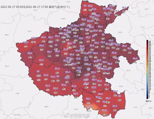 6月17日,河南最高气温分布图。来源:@河南气象