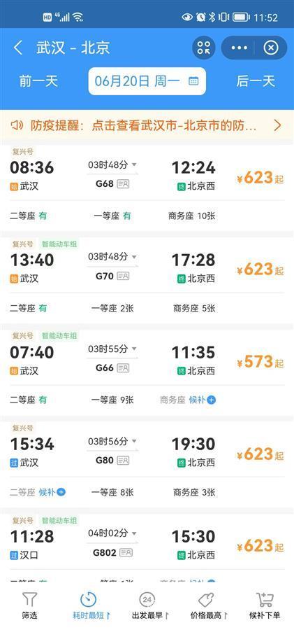 湖北日报讯(记者左晨、通讯员武铁轩)从武汉铁路局集团公司获悉,6月20日起,京广高铁京武段实现常态化按时速350公里高标运营,届时,同步增加开行大站直达高品质标杆列车和智能复兴号动车组,推出静音车厢、新型票制等新服务,实施灵活折扣、有升有降、优质优价的市场化票价机制,北京至武汉间最短运行时间压缩至3小时48分,旅客出行体验进一步提升。