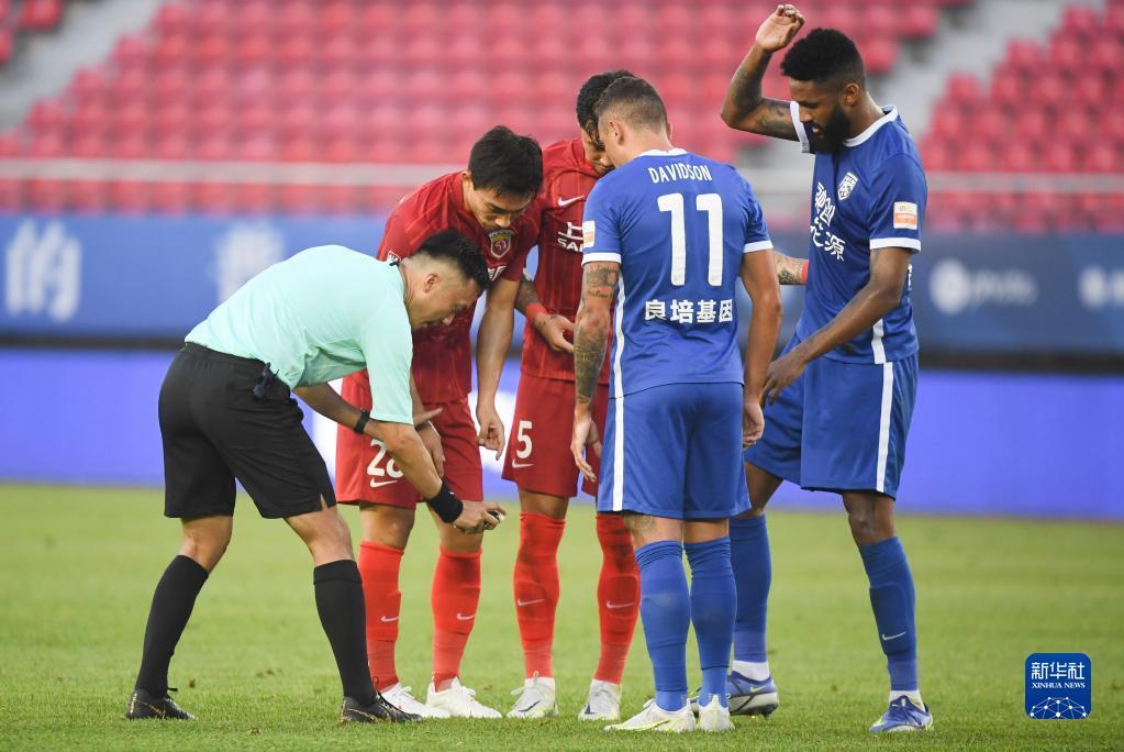 6月19日,主裁判唐顺齐(左三)查看武汉三镇队球员华莱士(下)的伤情。新华社记者 王乙杰 摄