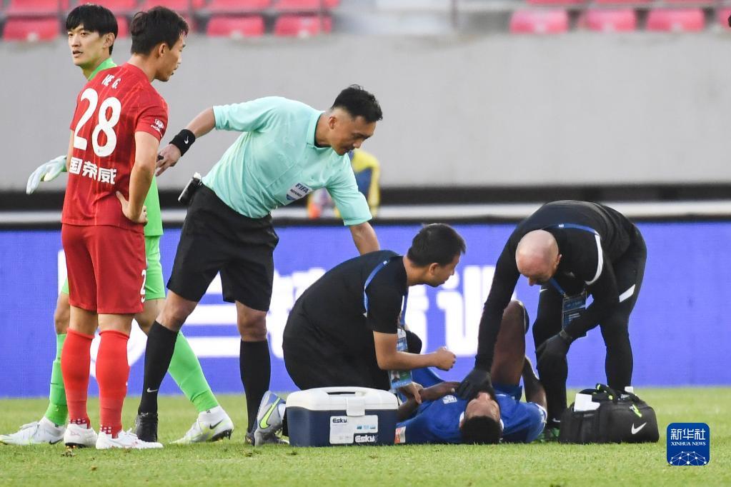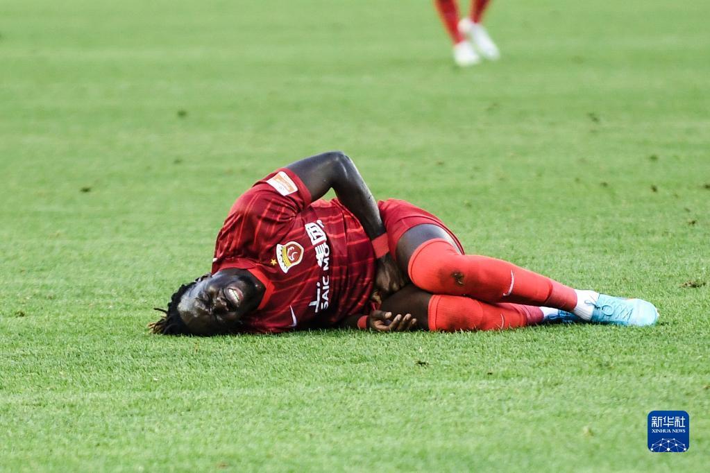 6月19日,上海海港队球员恩迪亚耶在比赛中受伤倒地。新华社记者 王乙杰 摄