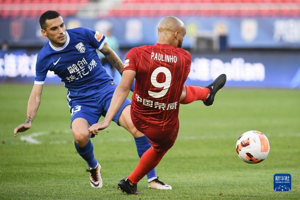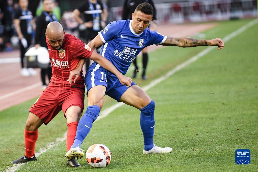 6月19日,上海海港队球员保利尼奥(左)与武汉三镇队球员戴维森拼抢。新华社记者 王乙杰 摄