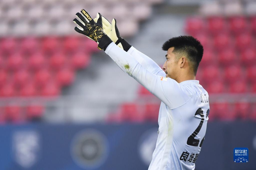 6月19日,武汉三镇队守门员刘殿座在比赛中向队员打手势。新华社记者 王乙杰 摄