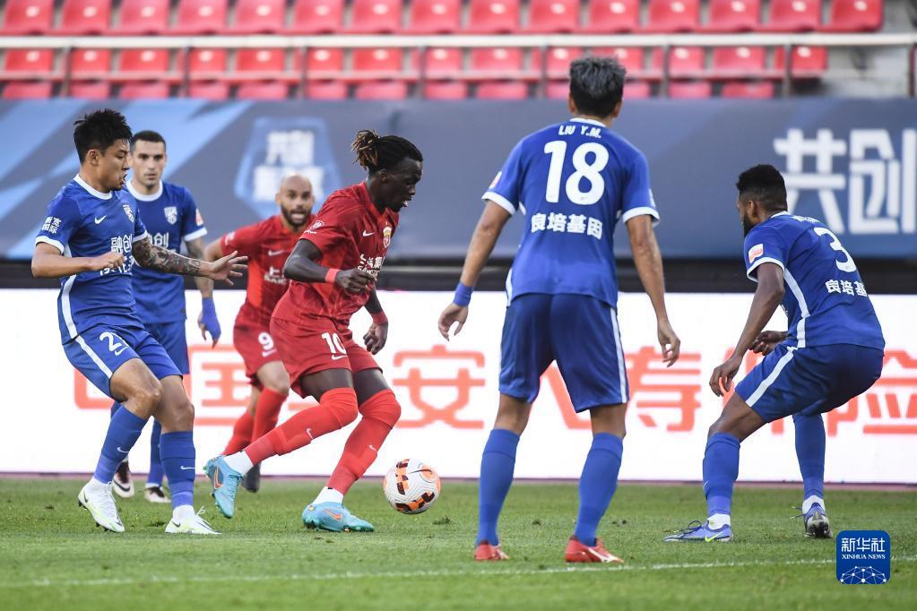6月19日,上海海港队球员恩迪亚耶(左四)突破武汉三镇队球员的防守。新华社记者 王乙杰 摄