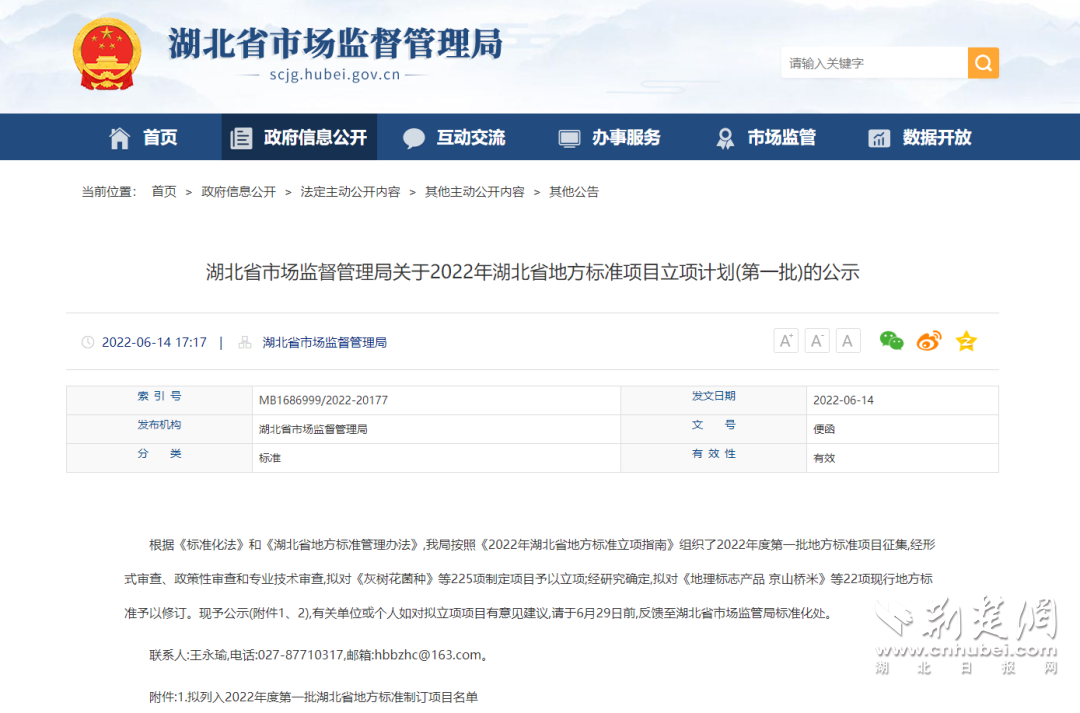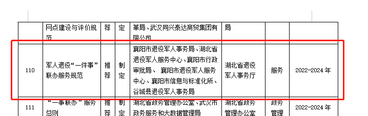 荆楚网(湖北日报网)讯(通讯员 毕静芳)近日,湖北省市场监督管理局发布《关于2022年湖北省地方标准项目立项计划(第一批)的公示》,确定225项制定项目、22项现行地方标准修订。其中,由襄阳市退役军人事务局作为主要起草单位申报的《军人退役“一件事”联办服务规范》被列入湖北省地方标准立项计划,成为全省退役军人事务领域第一个立项的省级地方标准。