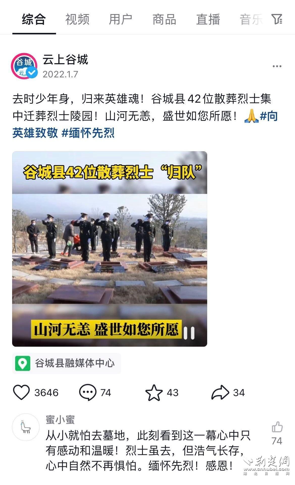 “从小就怕去墓地,此刻看到这一幕心中只有感动和温暖!烈士虽去,但浩气长存,心中自然不再惧怕。缅怀先烈!感恩!”在抖音上的一个谷城县烈士陵园视频评论区,这条点赞最多网友留言格外醒目。