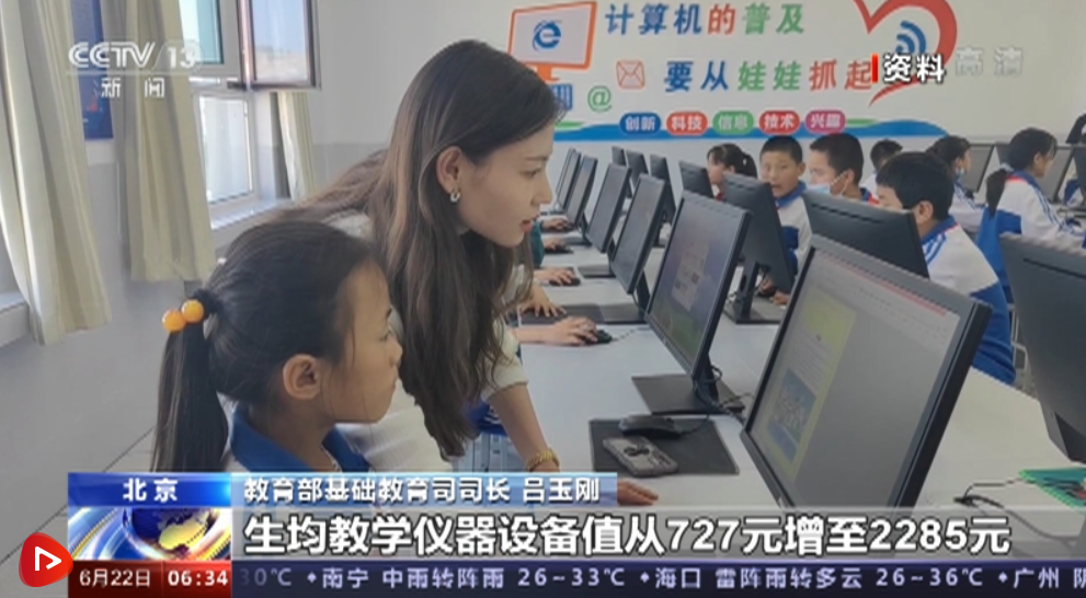 教育部基础教育司司长 吕玉刚:2012—2021年,全国义务教育学校生均教学及辅助用房面积从3.7平方米增至5平方米,生均体育运动场占地面积从7.3平方米增至8.2平方米,生均教学仪器设备值从727元增至2285元,互联网接入率由25%提升到近100%,义务教育基本办学条件得到显著改善。