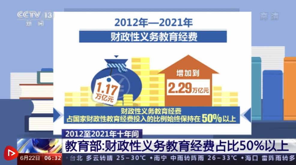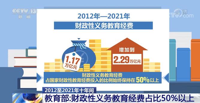 据统计,2012—2021年财政性义务教育经费从1.17万亿元增加到2.29万亿元,财政性义务教育经费占国家财政性教育经费投入的比例始终保持在50%以上,“两免一补”(免除学杂费、免费提供教科书,为家庭经济困难学生发放生活补助)实现城乡学生全覆盖。