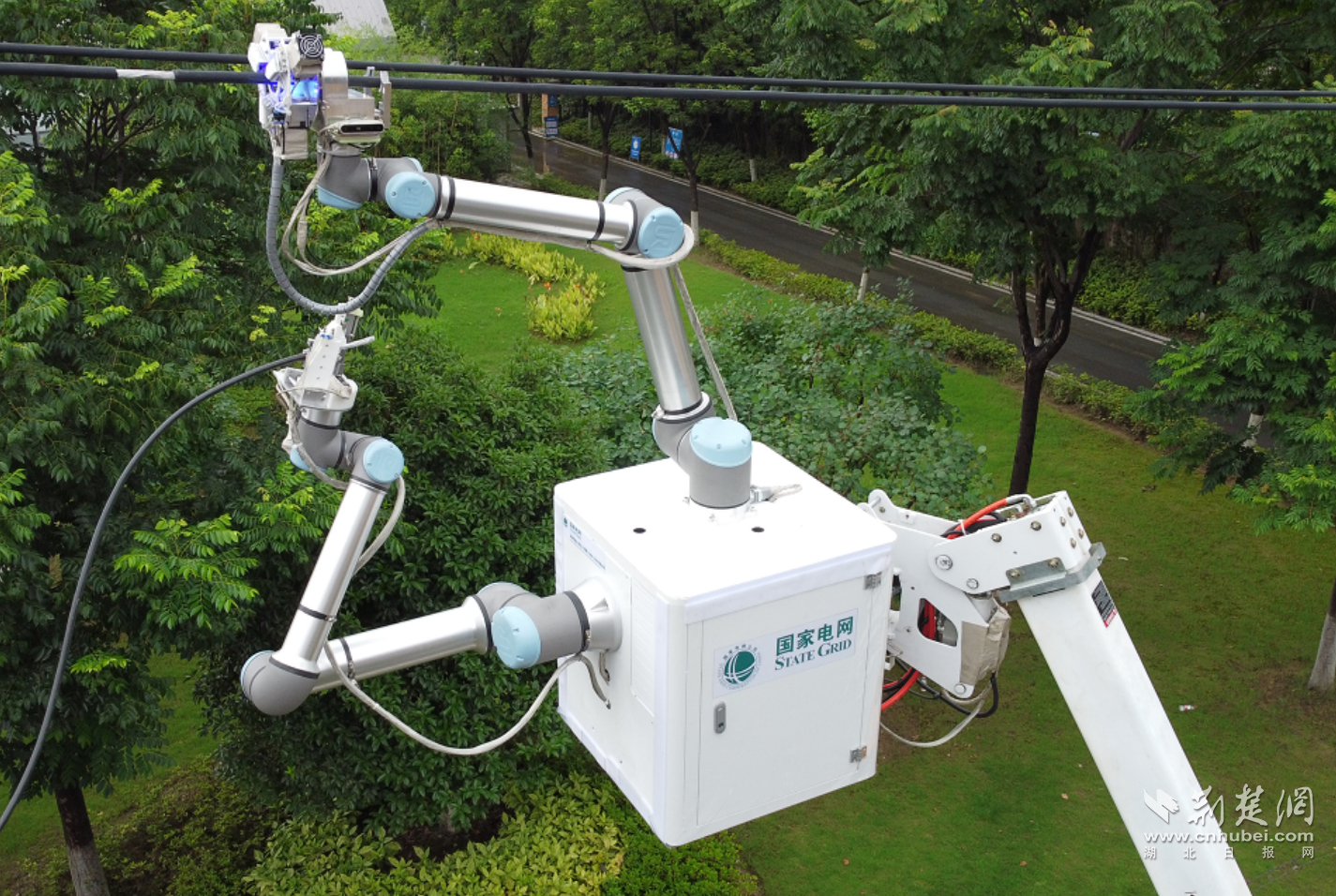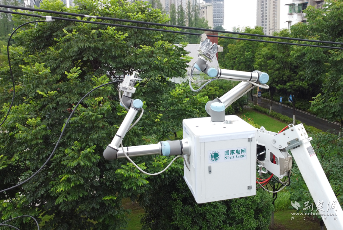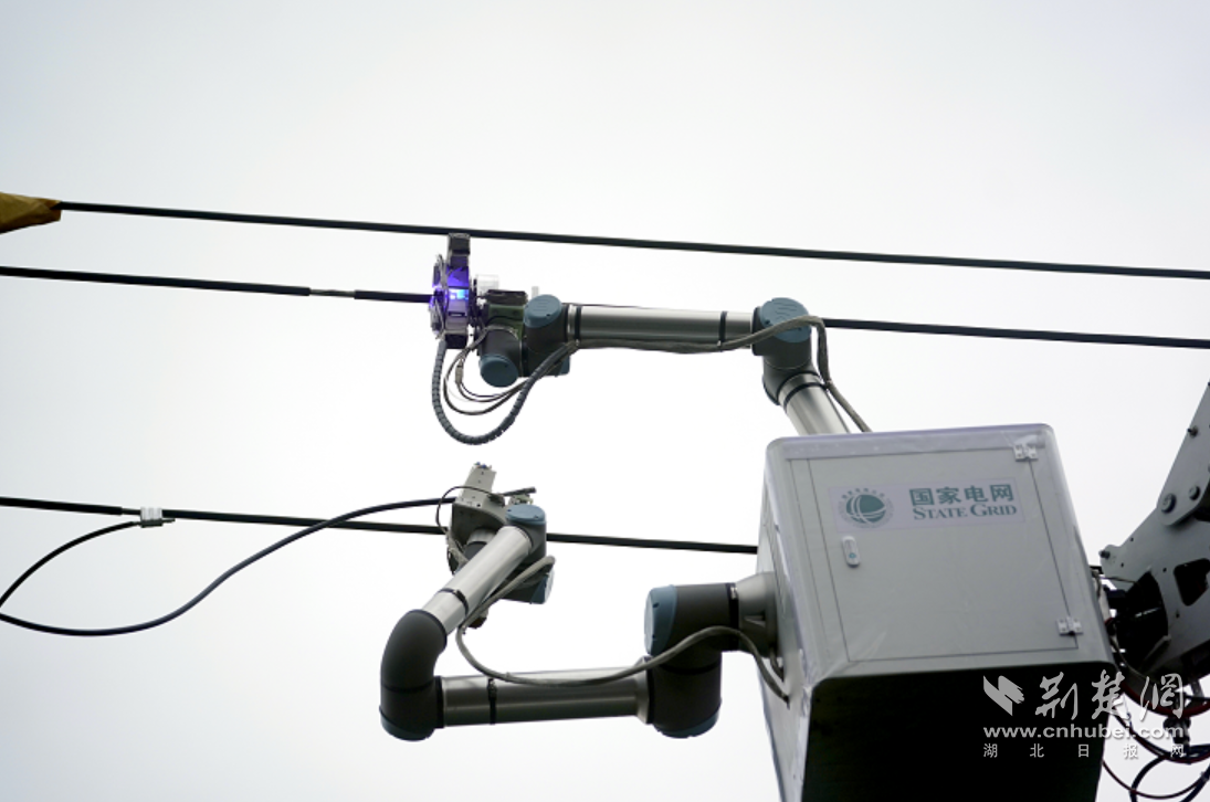荆楚网(湖北日报网)讯(通讯员 宋安琪 孙双学)6月24日,在武汉青山区建设五路10千伏阳光线13号杆处,带电作业车绝缘斗臂车上,带电机器人准确模拟带电作业检修工的双手,实现引线与主线的识别定位、牢固抓握,运用精确的激光切割技术剥离导线绝缘层,将引线与主线快速准确地放入线夹,而后紧固线夹完成分支引线搭接工作。