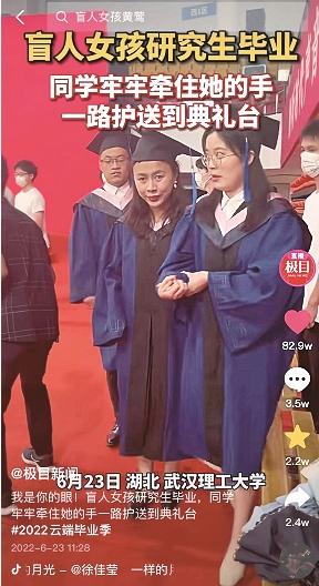 6月24日,“除了看不见,我什么都能做”的盲人女孩、武汉理工大学马克思主义学院硕士研究生黄莺顺利完成学业,参加学校毕业典礼的故事,在楚天都市报极目新闻客户端、微信公众号、微博、抖音、学习强国等平台传播,点击量数千万,登上抖音同城热搜榜。网友留言为她点赞:“好美的女孩,今后阳光永远照耀着她。”更有同校大学生深为这位学姐的励志精神感动,“虽然她看不见,但她成为了我人生的一束光”。