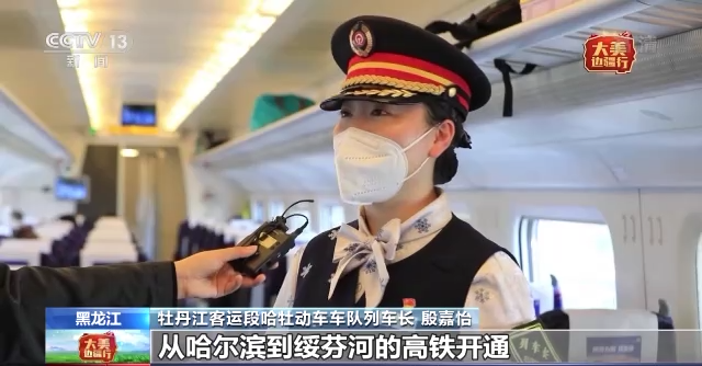牡丹江客运段哈牡动车车队列车长 殷嘉怡:从哈尔滨到绥芬河的高铁开通,我们就在这条线路上值乘,看到了旅客出行更加地方便快捷,从过去9个小时的旅途,现在缩短到3个小时左右。