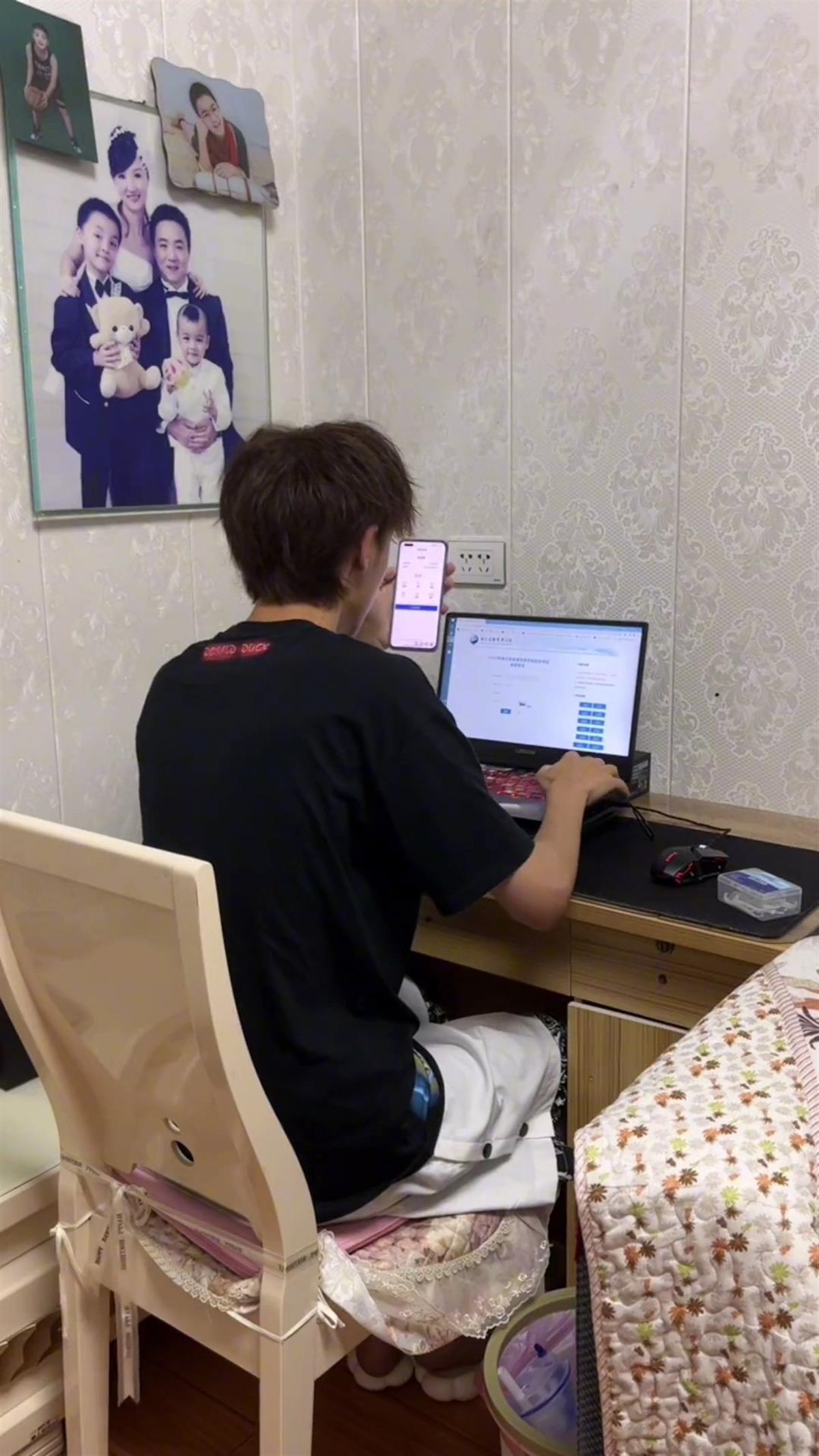 彭文乐的妈妈介绍,查分时远在深圳的丈夫和他们保持视频通话,一起分享了查到分数后的喜悦时刻。家里人都很满意彭文乐的高考分数,很为他感到高兴。