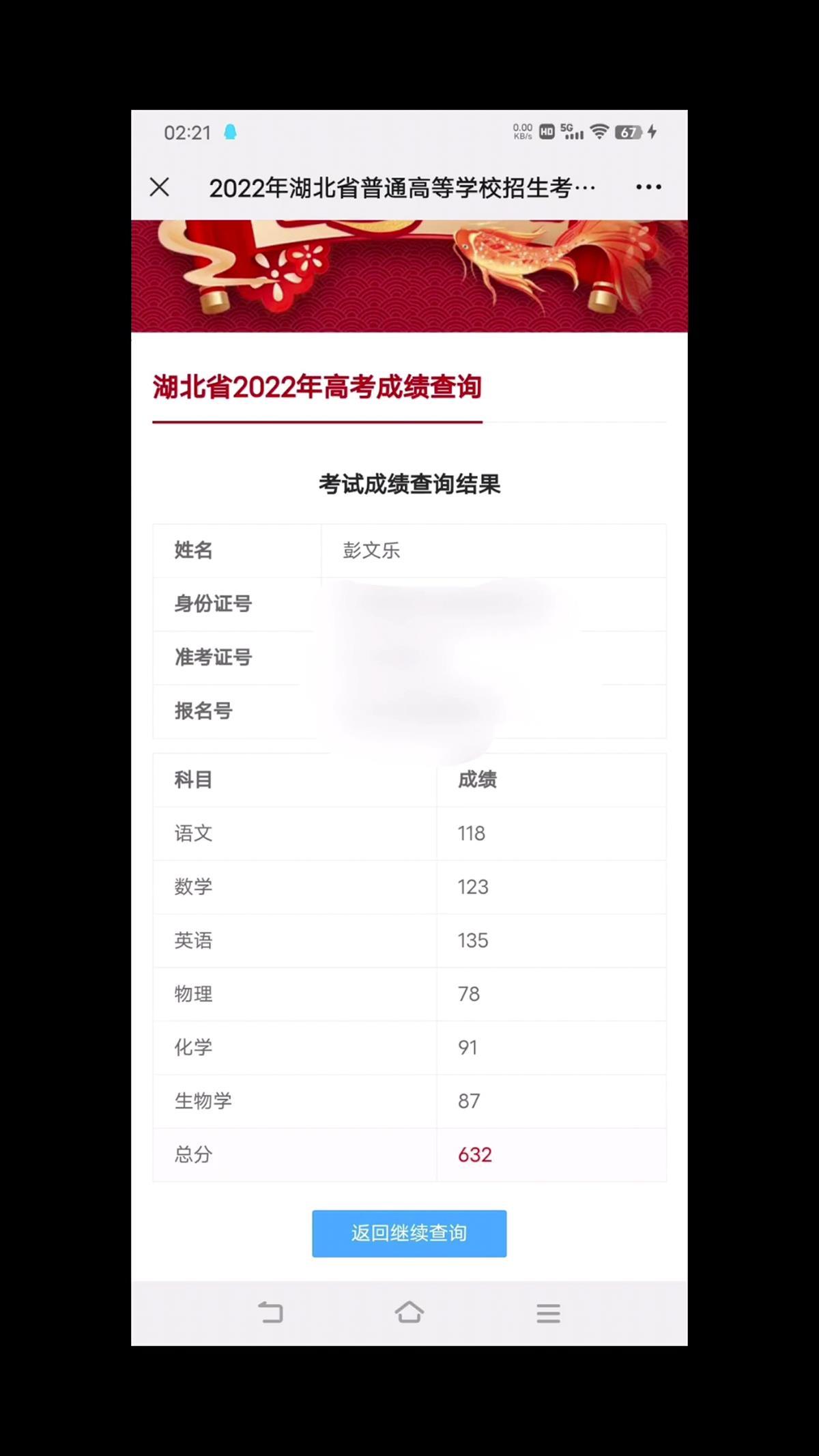 25日中午,彭文乐妈妈告诉极目新闻记者,彭文乐就读于湖北潜江中学,高考选的是语数外和理化生6个科目。她表示,现在他们在潜江彭文乐的爷爷奶奶家,25日凌晨高考成绩就出来了,但是一直没有查询,“今天早上9点半彭文乐要去学校拿毕业证等资料,我们就约定早上去学校前一起查成绩。彭文乐总分是632分,语文118、数学123、英语135、物理78、化学91、生物87。”极目新闻记者了解到,湖北省首选物理本科分数线为409分,彭文乐超过了分数线223分。