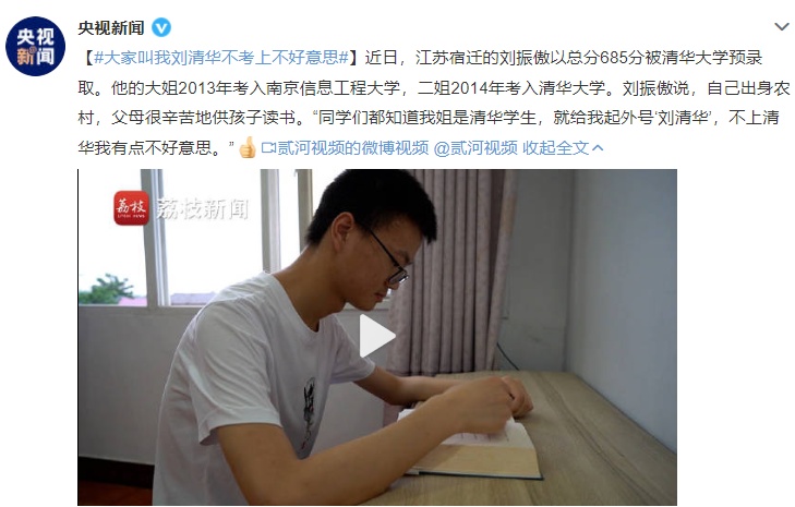 近日,江苏宿迁的刘振傲以总分685分被清华大学预录取。他的大姐2013年考入南京信息工程大学,二姐2014年考入清华大学。刘振傲说,自己出身农村,父母很辛苦地供孩子读书。“同学们都知道我姐是清华学生,就给我起外号‘刘清华’,不上清华我有点不好意思。”