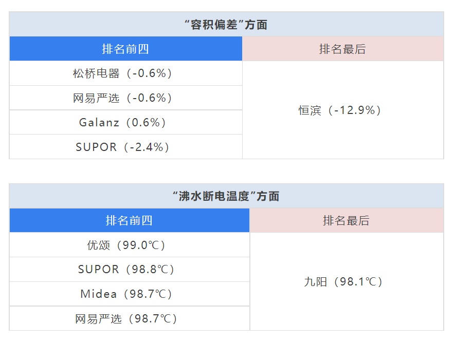 “半球”牌电热水壶、中山市恒滨电器有限公司生产的“恒滨”牌电热水壶的“容积偏差”指标不符合标准要求,分别达到了-9.0%和-12.9%,存在虚标容积的嫌疑。(标准要求容积偏差限值:±5%)
