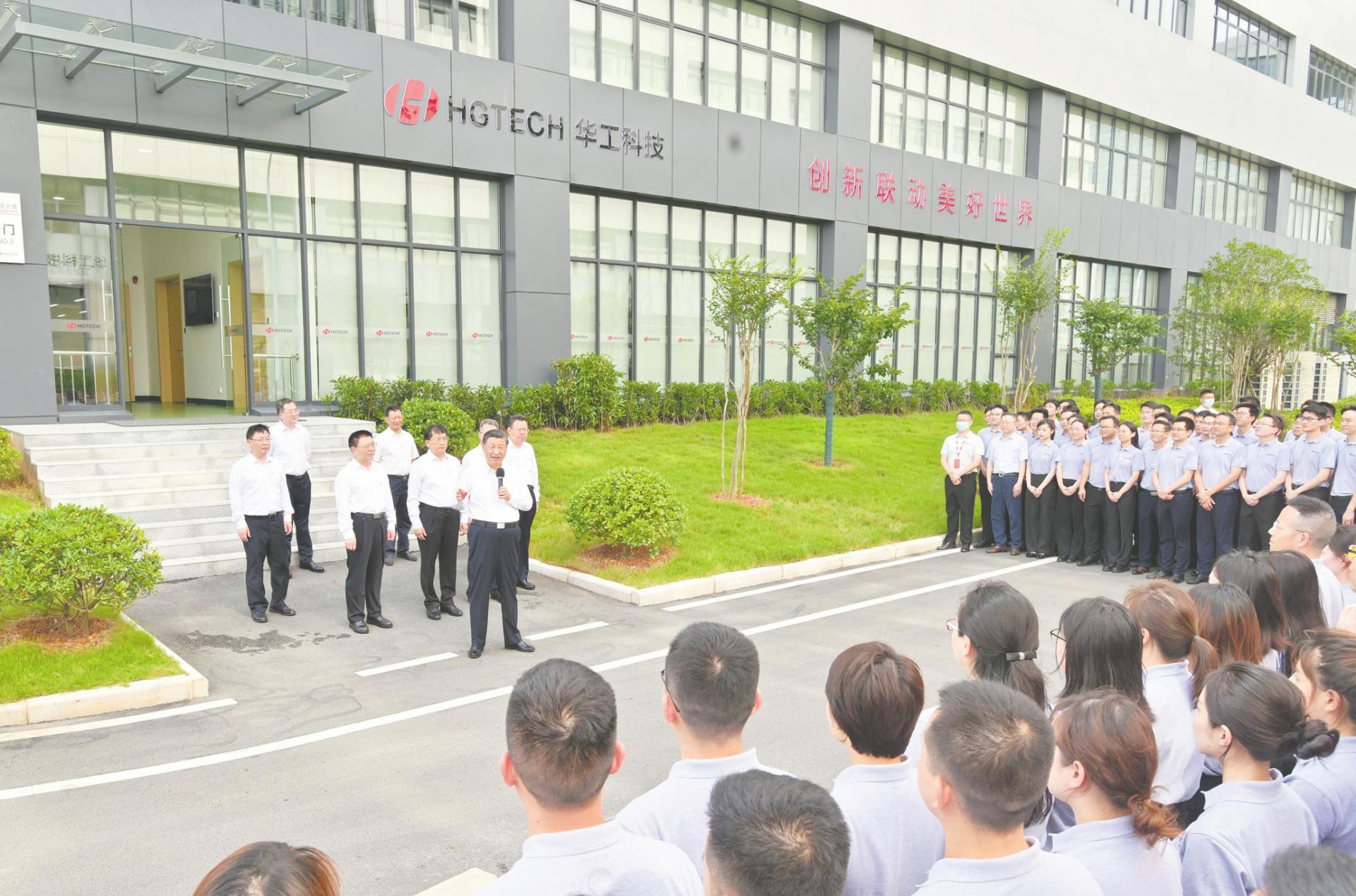 6月28日下午,中共中央总书记、国家主席、中央军委主席习近平在武汉华工激光工程有限责任公司车间大楼前,同企业职工亲切交流。 (新华社发)