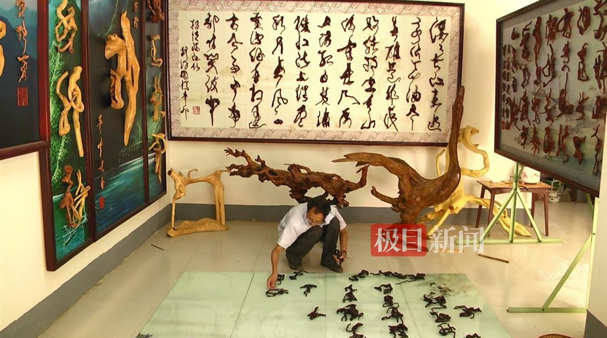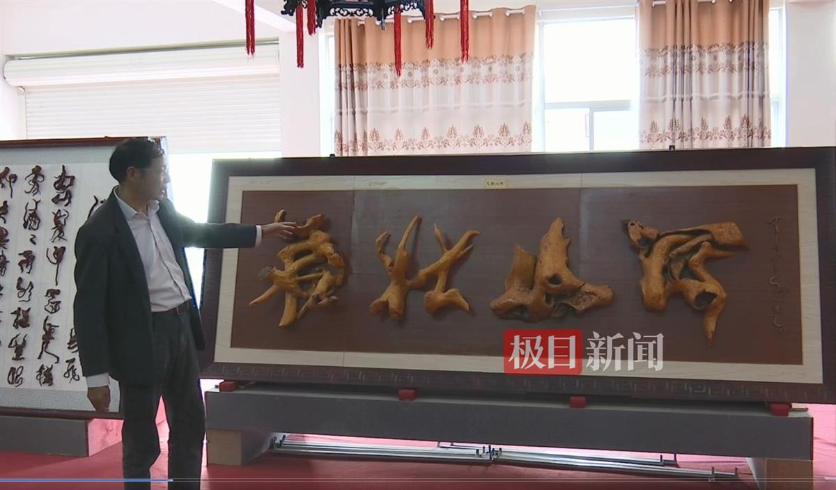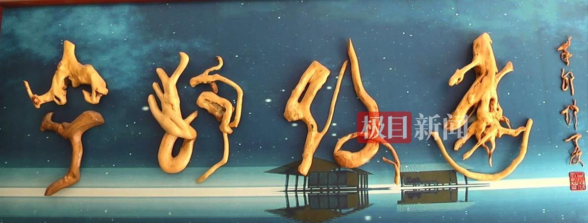 6月24日,极目新闻记者在两峪乡根艺博物馆中看到,一幅“气壮山河”字样的根书作品气势恢宏,颇为显眼。刘汉国告诉记者,这幅作品长度有3米多,一个树蔸一个字。这幅作品是他在2015年创作的,收集、挑选树材,构思、创作等,前前后后耗费一年多时间。