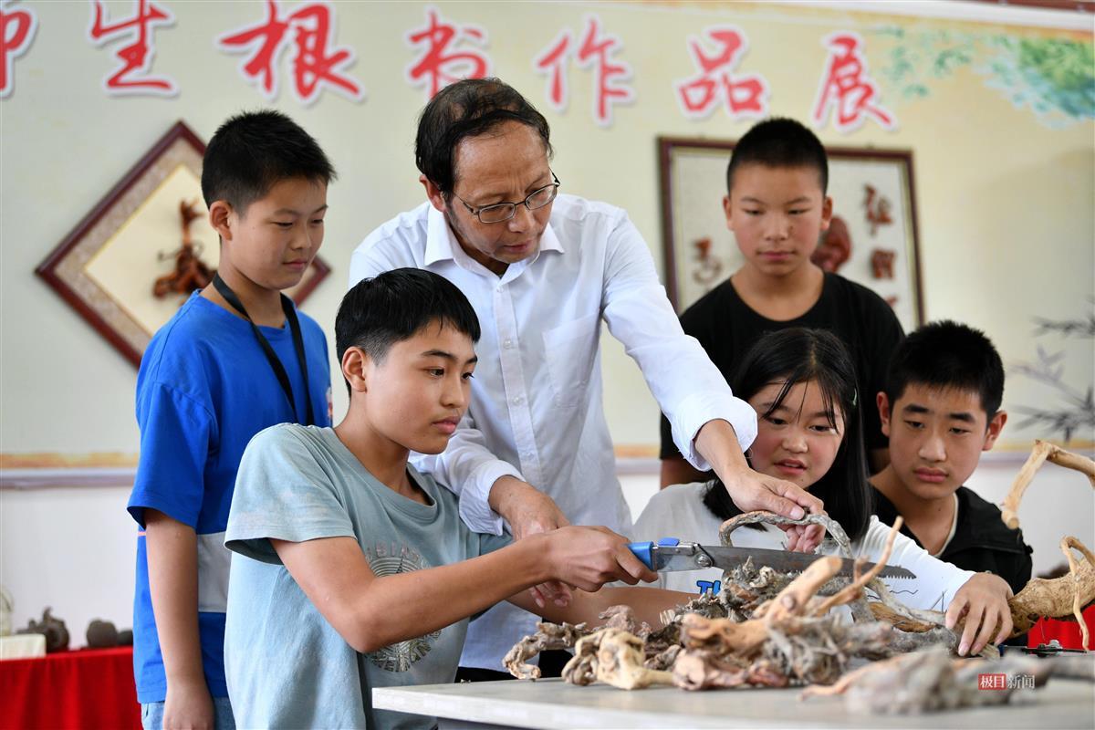 刘汉国指导孩子们制作根雕(图片通讯员 杨韬 摄)