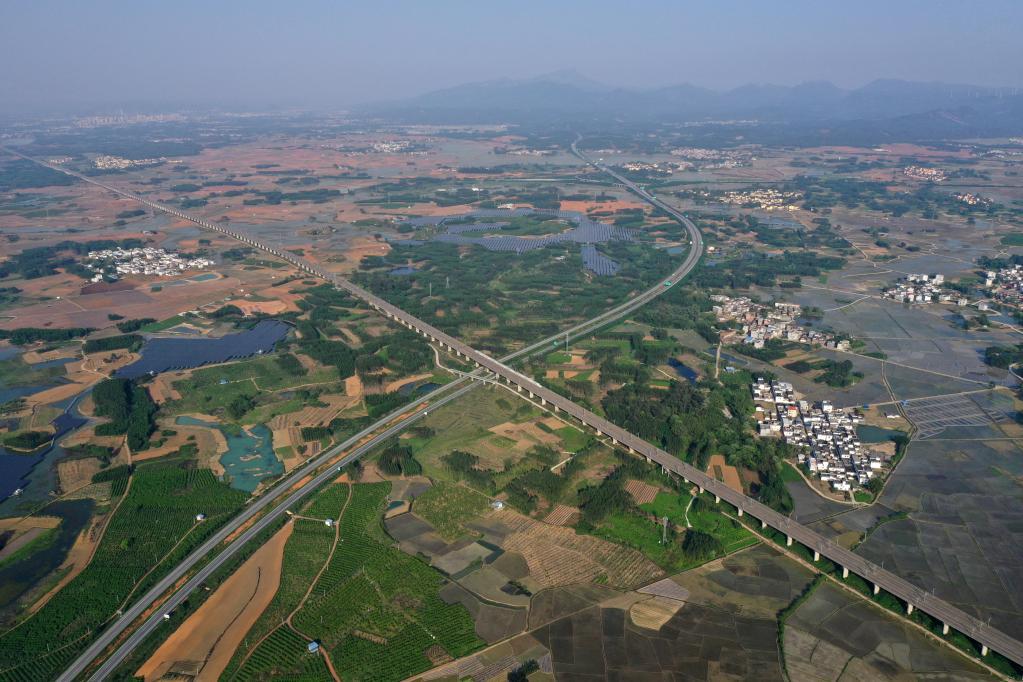 南广高铁和苍硕高速在广西宾阳县古辣镇交会(无人机照片,4月4日摄)。新华社记者黄孝邦摄