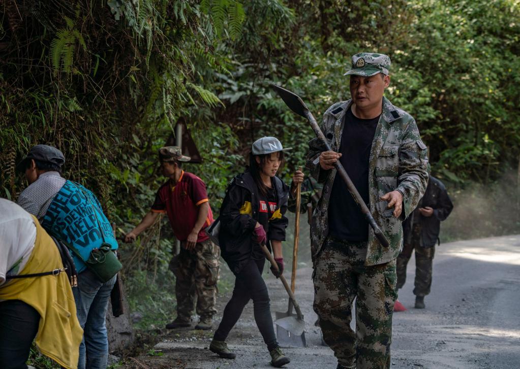 在云南贡山县独龙江乡巴坡村,王世荣(右一)带领乡亲们一起劳动(资料照片,2019年4月25日摄)。新华社记者江文耀摄