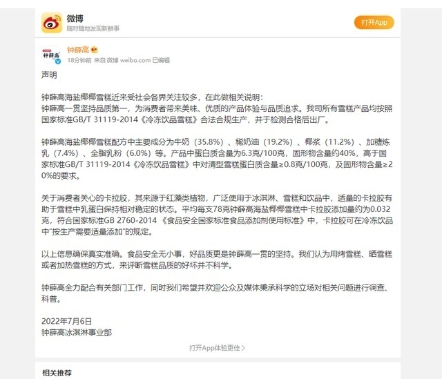 钟薛高全力配合有关部门工作,同时我们希望并欢迎公众及媒体秉承科学的立场对相关问题进行调查、科普。
