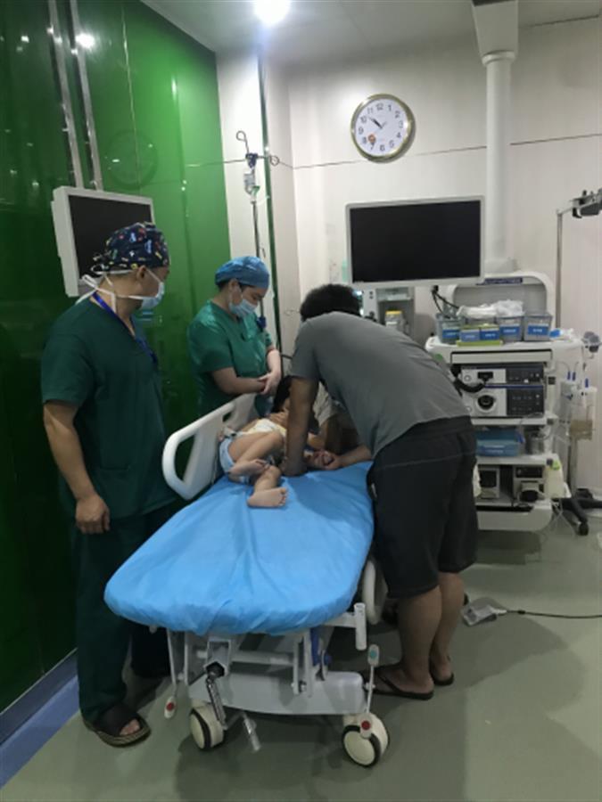 因为幼童年龄小,不懂和医生配合,如果要做胃镜,必须采用麻醉。经过麻醉科医生的评估,消化内科副主任医师冯凯、护士周丽华在麻醉科专家的紧密协作下,为幼童实施无痛内镜下食管异物取出术,术中可见一个硬币卡在幼童的咽喉部,专家凭借精湛而娴熟的技术,仅用数分钟,顺利取出威胁幼童生命的食管异物。待幼童清醒后,他很快恢复活泼的天性,家人对医生感激不已。