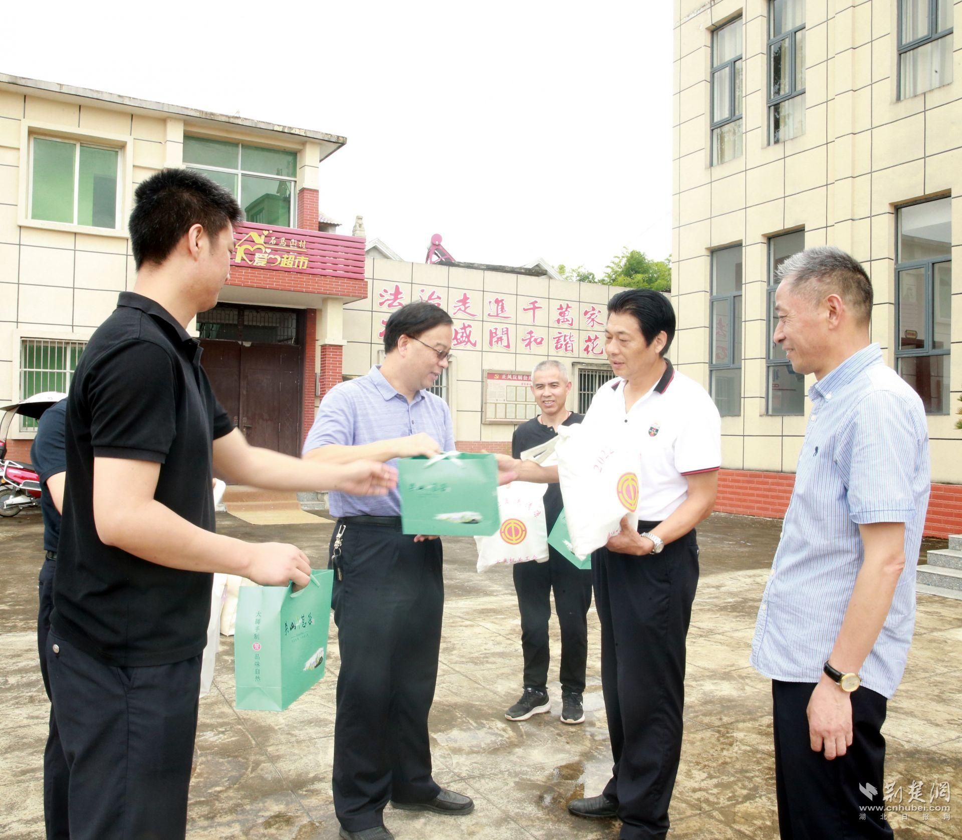 垸场会结束后,在石马山村村委会,省监狱管理局机关党委、汉阳监狱分别对驻村工作队进行了慰问,并送上“送清凉”慰问物资,并在村委会共同开展了主题党日活动。会上,曹强新转达了党组织对三名驻村工作人员的关心关怀,号召全体党员学习驻村党员干部不惧辛苦、为民服务的精神。汉阳监狱崔官兵代表基层单位发表感言,向驻村干部致敬,表达了基层单位以驻村干部为榜样,奋发有为、倾尽全力推动全省监狱事业发展、维护社会安全稳定的坚定决心。