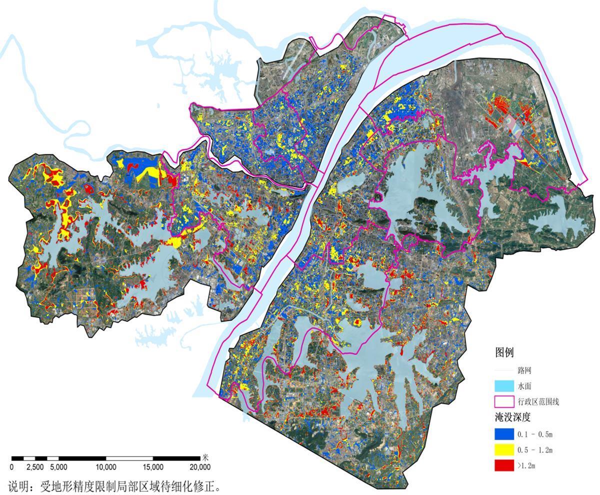 武汉市超标降雨城市内涝风险图,【该图以武汉市百年一遇雨型(即:最大小时降雨126毫米,最大1日降雨365.4毫米,最大3日降雨508.9毫米,最大7日降雨669.7毫米)为设定条件,通过模型演算得出】