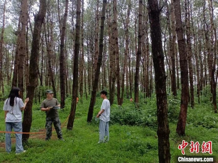 图为广西生态工程职业技术学院2020届林业技术专业的学生在该校附近的森林内进行实训。 广西生态工程职业技术学院提供