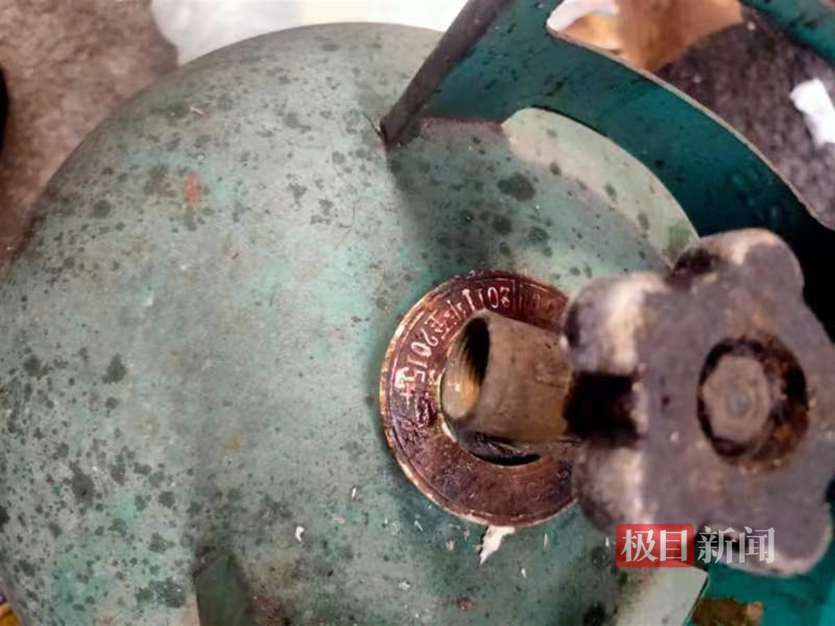 极目新闻记者在李女士提供的照片上看到,钢瓶整体完整,但瓶身多处被熏黑。在瓶口的阀门处,有一个锈迹斑斑的金属环,上面有“2011年-2015年”的字样。钢瓶涂着绿色油漆,上面印着“佳能气”“95007”字样。