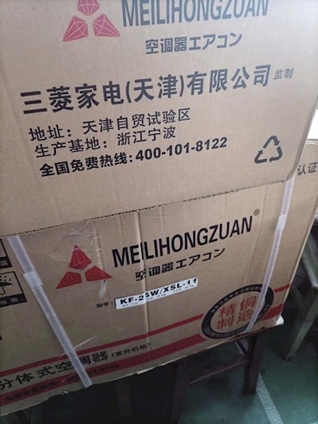 通过王爹爹提供的空调实物照片,记者发现,品牌标识也与网络页面上呈现的有差别。空调上标识由三个不规则形状组成,大写字母也变成了“MEILIHONGZUAN”,外包装还印着三菱家电(天津)有限公司,并配有400免费热线电话。