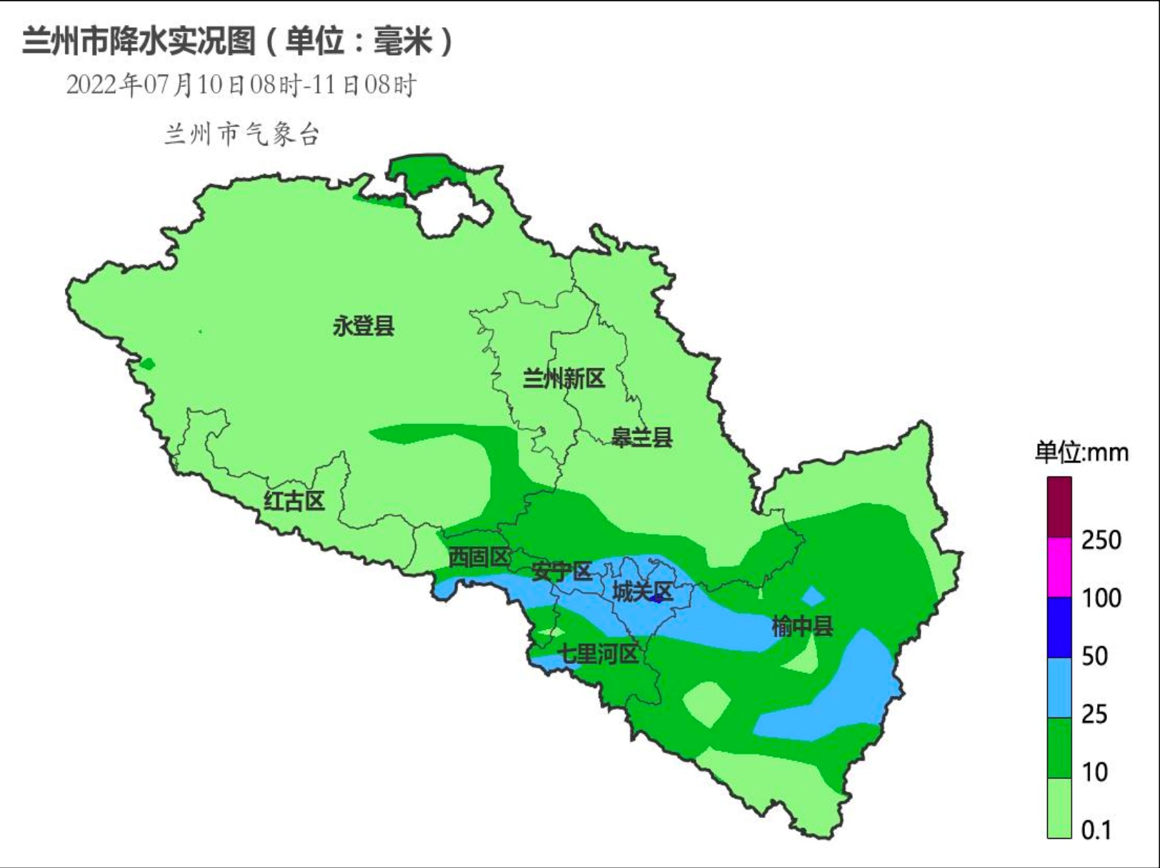 7月10日下午开始,甘肃兰州大部地区出现小到中雨,11日4时起主城区及榆中等地出现强对流,城关区、七里河、榆中出现大到暴雨。截至11日08时,兰州全市共计137个观测站(74个乡镇)出现降水,其中,暴雨4站,大雨26站,中雨42站,小雨65站。较大降水量出现在:城关万佳国际家居67.2毫米、城关水车园58.1毫米、城关青白石54.9毫米、城关教育学院50.4毫米、榆中韦营45毫米、榆中齐家坪42毫米,其余站点降水量均在40以下。