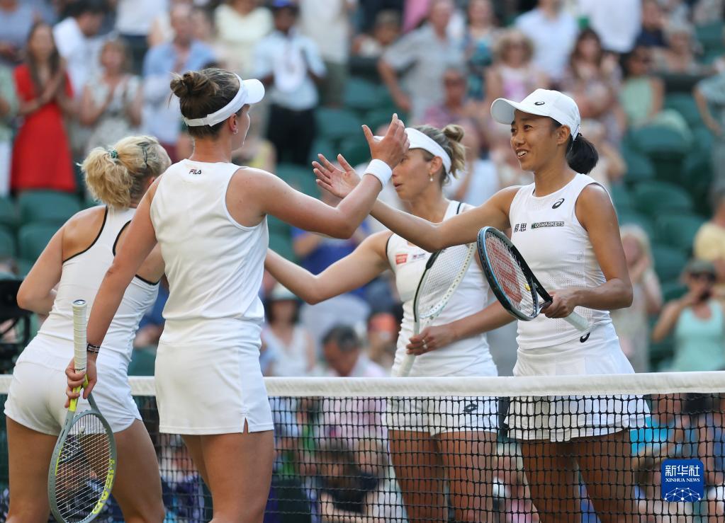 7月10日,张帅(右一)/梅尔滕斯(右二)在比赛后与对手握手致意。新华社记者 李颖 摄