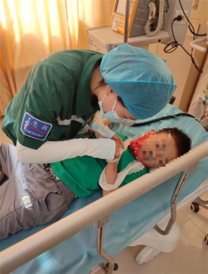 清理完污物后,周真用活力碘消毒伤口,并安排小孩去拍X片,得知小孩没有骨折,大家都放心了,小孩父母连声说:“谢谢医生护士和消防员的及时救助!”
