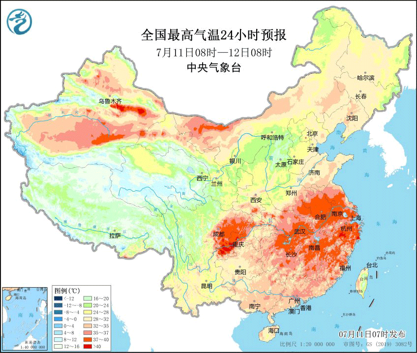 未来一周,新疆南疆盆地、四川盆地中东部、黄淮南部、江淮、江汉、江南、华南等地有持续性高温晴热天气,大部地区日最高气温一般为35~38℃,局地可达40℃以上。
