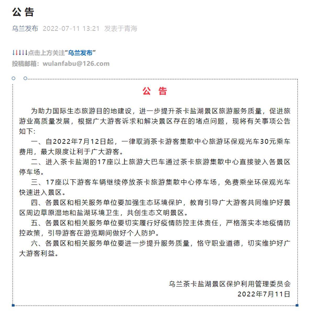 该公告称,根据广大游客诉求及景区存在的堵点问题,自2022年7月12日起,一律取消茶卡游客集散中心旅游环保观光车30元乘车费用;同时,让进入茶卡盐湖的17座以上的旅游大巴直接驶入景区停车场;并要求各景区和服务单位提升服务质量,提升职业道德。