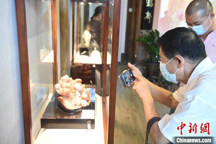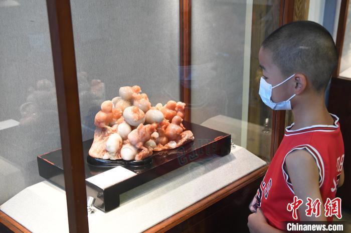 由中国工艺美术大师林东创作的寿山石雕刻作品《新生》吸引观众眼球。 记者刘可耕 摄