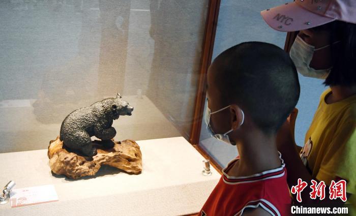 由中国工艺美术大师林亨云创作的寿山石雕刻作品《黑熊》吸引孩子们观看。 记者刘可耕 摄