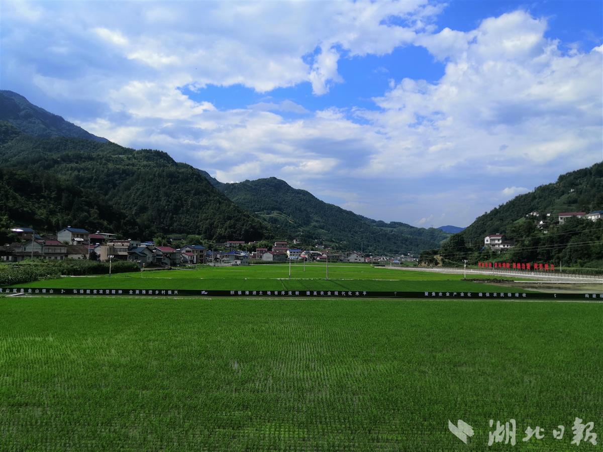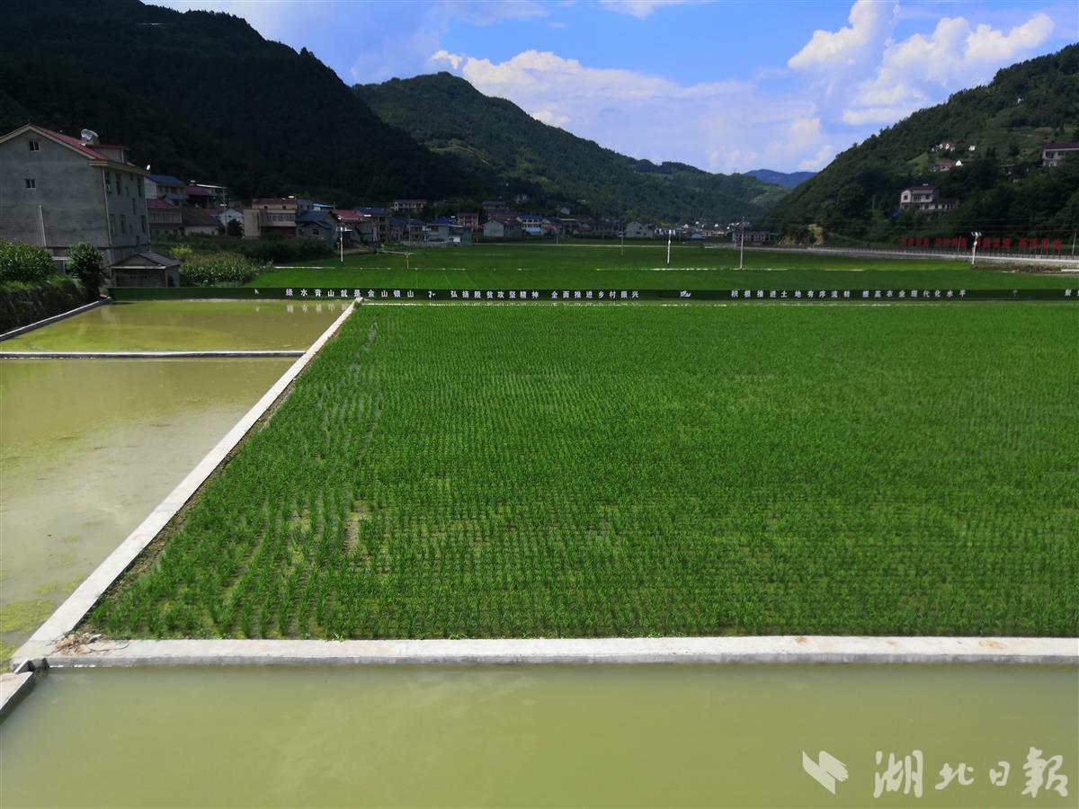 车在翠绿青山间穿行,驶进长阳土家族自治县渔峡口镇枝柘坪,豁然开朗——千亩秧苗随风起舞,眼前跳出一片青青世界。