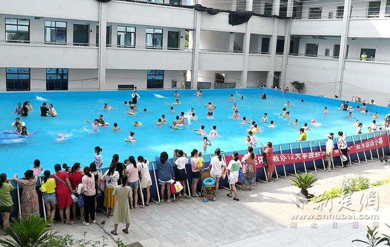 炎炎夏日,亲水降暑是人的天性!堵不如疏!今年暑假,习家店镇中心学校除了一如既往周密组织老师在库区巡河,发放宣传单、签订防溺水责任书等“堵”的方式,教育辖区青少年不到库塘河堰等水边游泳玩水外,他们在“下察解暖”活动中了解到家长和孩子们都有能够像城里孩子们那样在游泳池里戏水降暑、学习游泳技能的愿望后,主动作为,与城区的一家游泳俱乐部联系,请他们把充气游泳池带到乡镇,学校供水,俱乐部出人力物力和净水循环技术,给乡镇孩子们搭建一个戏水亲水,学习游泳技能的平台。经过紧锣密鼓的筹备,7月5日,丹江口市这家俱乐部如期了来到丹江口市江北农业大镇,在习家店镇小学搭建的露天游泳池开张了。每期12天,不及城区一半的费用,丹江口库区江北农业重镇习家店的孩子们趋之若鹜。