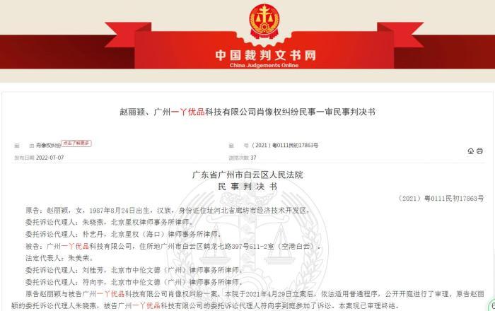 中新网7月14日电 据中国裁判文书网信息,近日,赵丽颖与广州一丫优品科技有限公司肖像权纠纷一审法律文书公开。