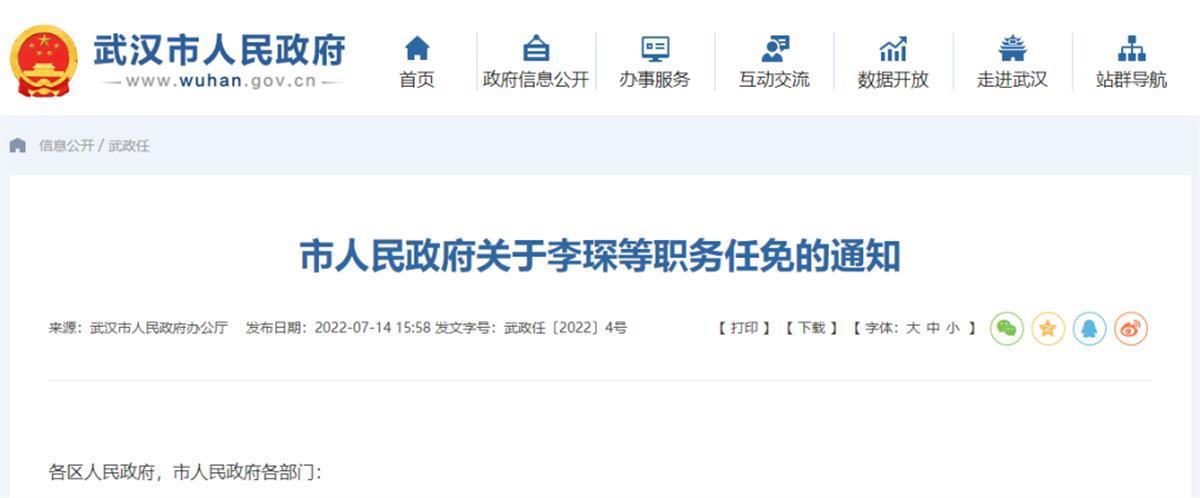 任命李琛为武汉市人民政府驻上海办事处主任;