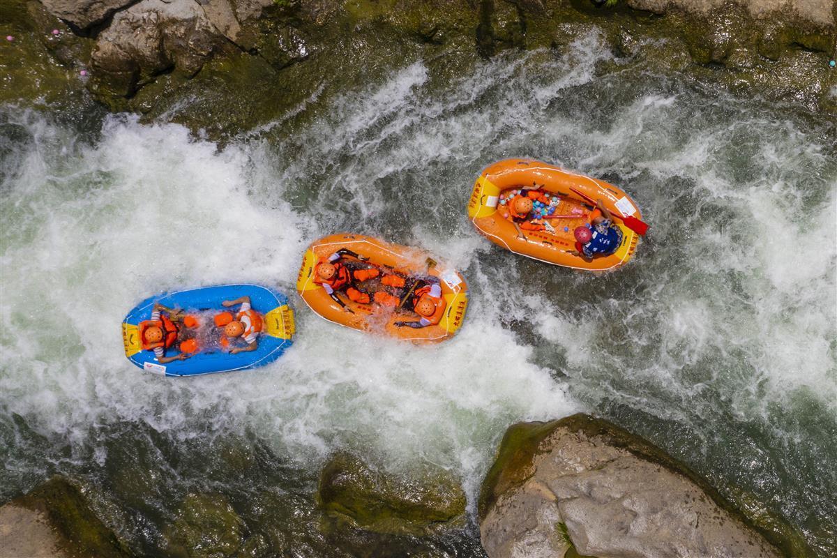 当天,活动主办方还组织了200名青年朋友,两人一队随机组合,乘坐漂流筏,一路完成挑战任务。两岸绝壁林立,茂林环绕,游客在飞扬的浪花中一路尖叫、一路欢笑,欢呼声在山间回荡。