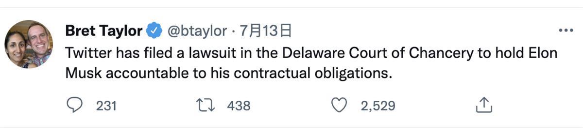 7月13日,推特董事会主席泰勒(Bret Taylor)在推特上称已向法院起诉马斯克,敦促其完成交易(图源:社交平台截图)